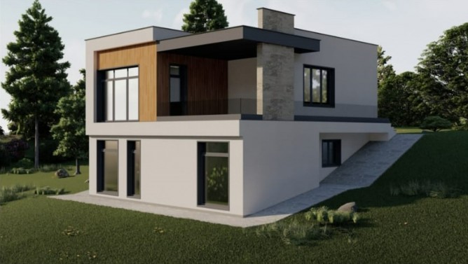 Двухуровневый дом на склоне с видовыми характеристиками на чащу леса. Газ, вода, электричество, асфальтовая дорога, автономный септик - включены в стоимость.