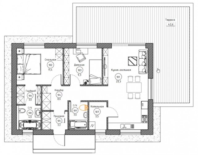 Общая площадь - 86 м².Кухня-гостиная с панорамными окнами и выходом на террасу