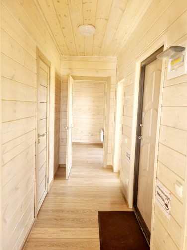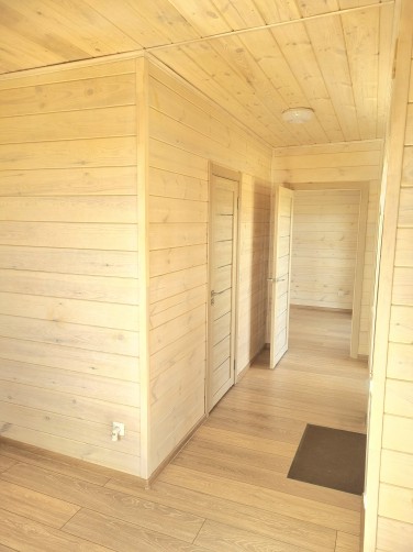 Сделана вся внутренняя отделка- имитация бруса (стены, потолок),пол -ламинат кл 33, межкомнатные двери.