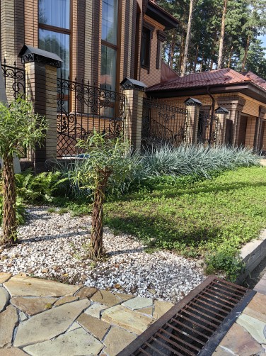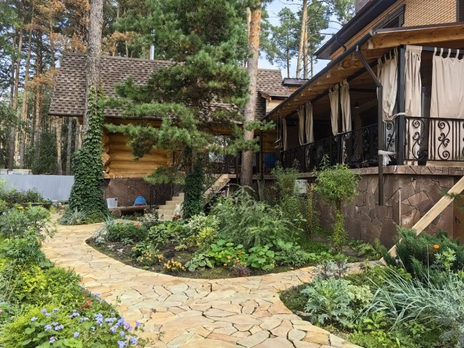 Двор очень красивый и ухоженный с большим количеством зелени и соснами.