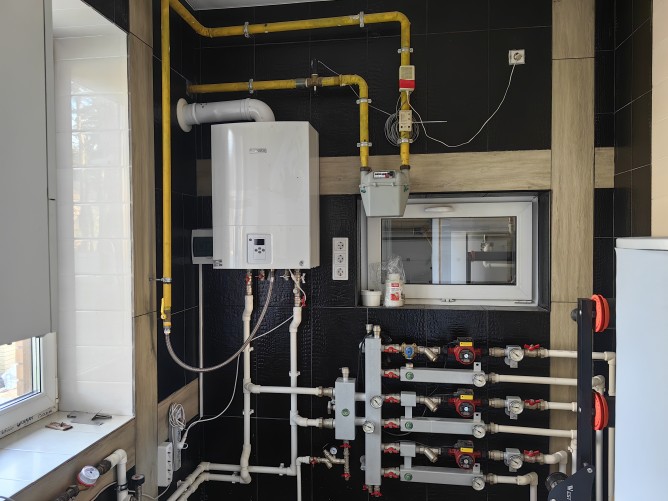Две системы отопления: теплый пол в каждом помещении + радиаторы. Отопление газовое. Расход газа зимой в месяц 1200 куб.м.