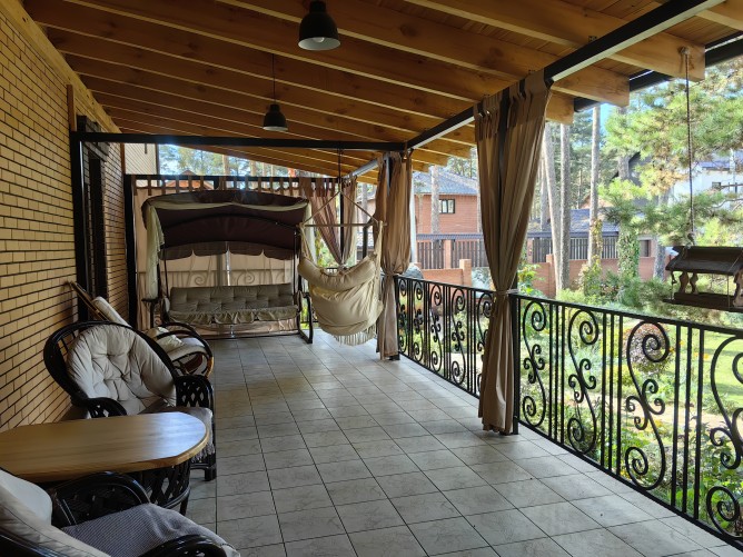 Терраса благоустроенная 60 кв.м с выходом во двор. На террасе стоят ратанговые кресла, кресло-качалка, столик. Можно пить чай-кофе, любоваться соснами и наслаждаться пением птиц. Частенько заглядывают белки! Иногда встречаются ёжики.