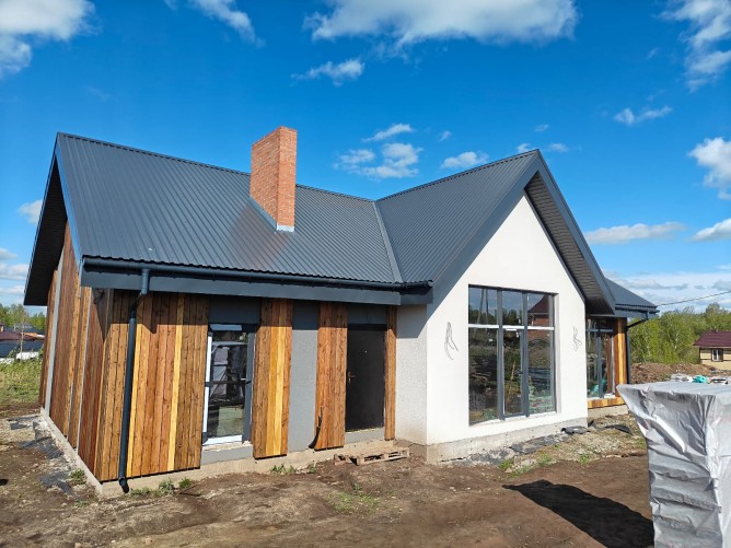 🔧 Строительство как для себя:• Фундамент — ж/б плита 300 мм, двойное армирование• Стены — Сибит 400 мм (тепло/прохлада)• Перегородки — 200 мм (шумоизоляция)• Кровля — профлист, утепление 200 мм• Окна — антрацит, панорамные 2,5 м• Фасад — Церезит + лиственница• Септик — 9 м³, двухкамерный