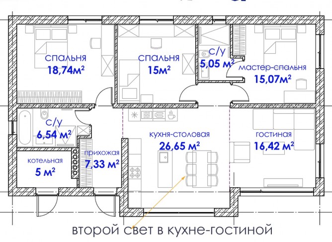 – Кухня-гостиная 43 м² с панорамными окнами