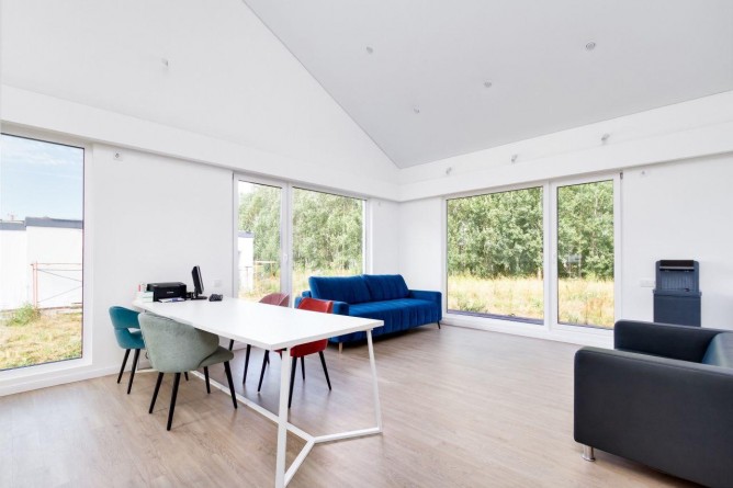 В доме большая кухня-гостиная с кухонным гарнитуром, большим обеденным столом, 2 дивана, 4 стула.