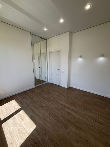 2 сан узла. 2 спальни, в одной место под гардероб, во второй встроенный шкаф с зеркальными дверями. везде стоят розетки, светильники.