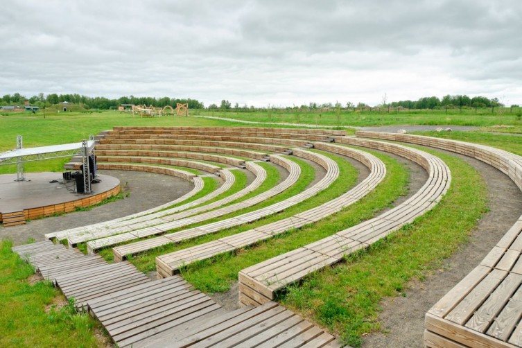 На территории парка природа сформировала естественное углубление в рельефе. Это позволило организовать природный амфитеатр, оформив один из склонов террасами и сформировав полукруг из грунта.