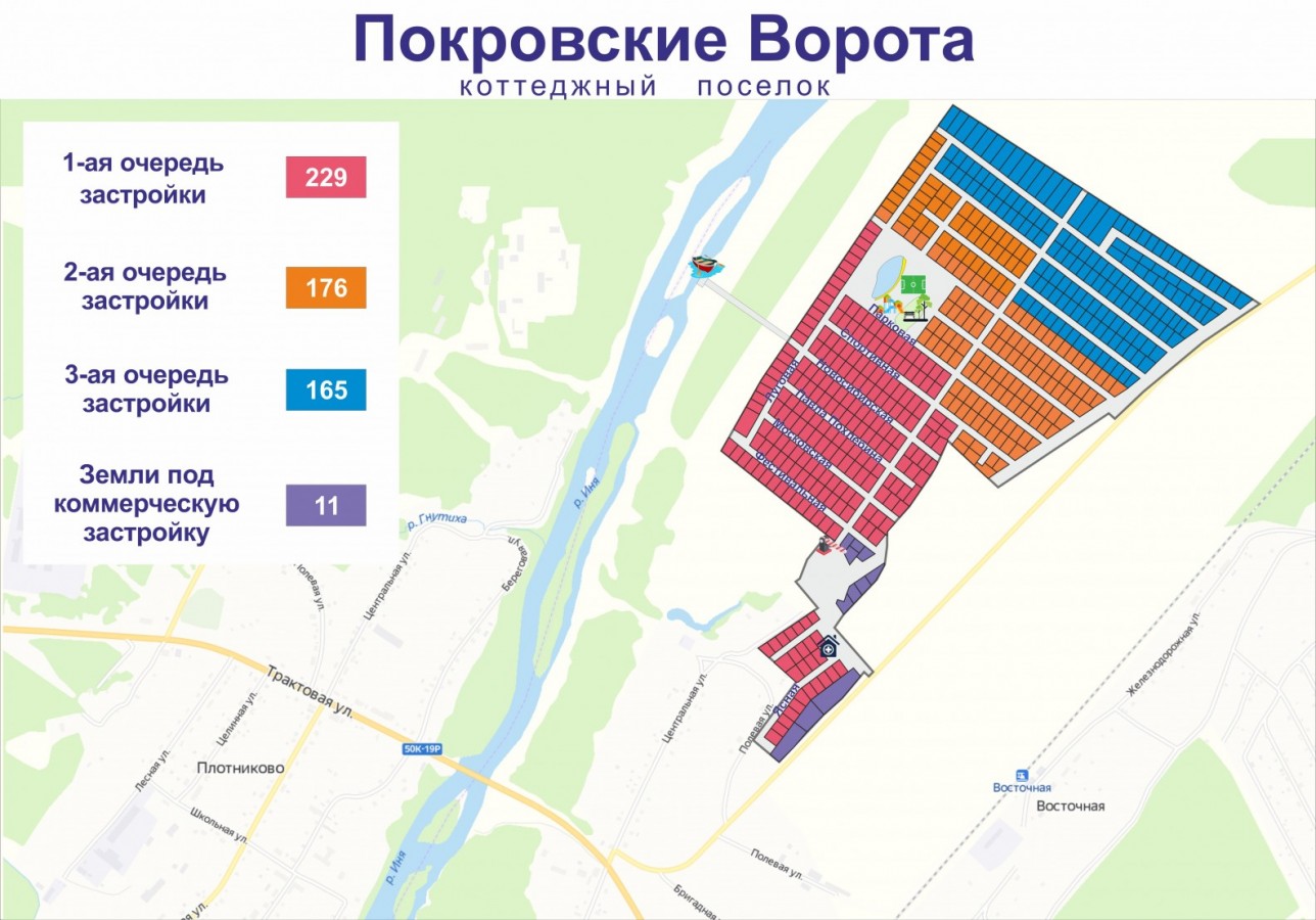 Широкий выбор участков на интерактивном генплане поселка Покровские ворота с актуальными ценами и статусами. Действует сельская ипотека: сразу можно рассчитать платеж и подать заявку в Россельхозбанк. Коттеджный поселок Покровские ворота расположен на северо-восточной окраине деревни Шмаково, в зеленой зоне на живописном берегу реки Иня, в 550м от станции электропоездов Восточная. Вдоль границы поселка Покровские ворота проходит круглогодично обслуживаемая асфальтированная дорога.