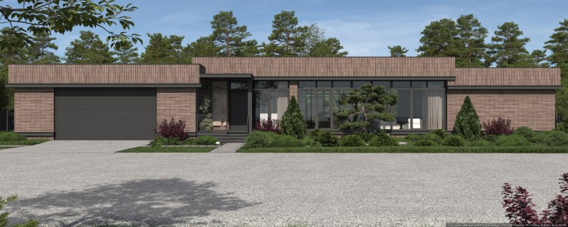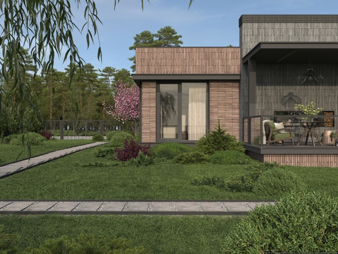 Дом сочетает в себе строгие геометрические формы с элементами природной эстетики. Просторные панорамные окна обеспечивают естественное освещение и визуальную связь с окружающим ландшафтом. Он идеально подходит для комфортной жизни, объединяя современный дизайн и функциональность.