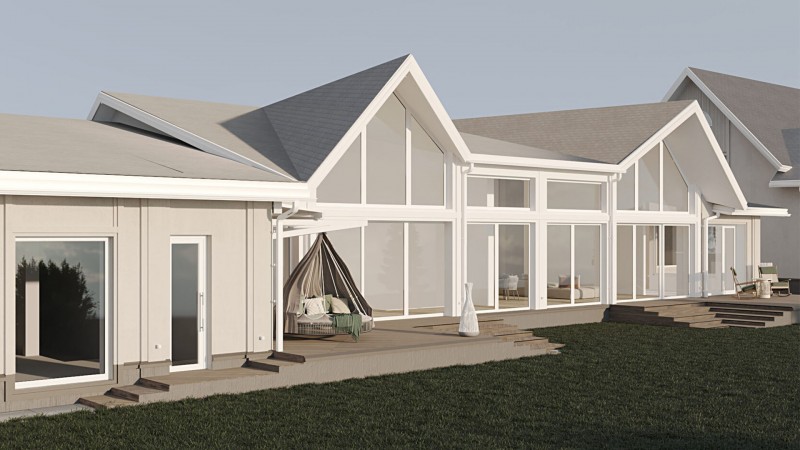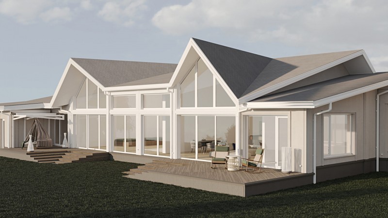 Дом включает спа-комплекс с бассейном, хамамом и просторной зоной для отдыха. Ключевой особенностью этого проекта является многоскатная крыша, которая позволяет играть с высотами, создавая интересное внутреннее пространство и выделяя основные функциональные зоны.