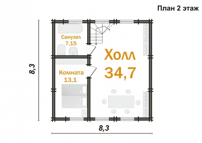 Проект "Дюссельдорф 2" предлагает просторную кухню-гостиную, уютную спальню, комфортабельную террасу и внушительный холл на втором этаже. Большой холл можно использовать как центр для семейных и дружеских встреч, игровую зону для детей или даже создать дополнительную спальню, установив перегородку.