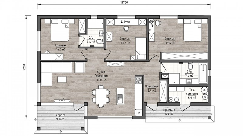 1. Небольшое количество внутренних перегородок. В стиле ценится наличие большого количества свободного пространства и естественное освещение.