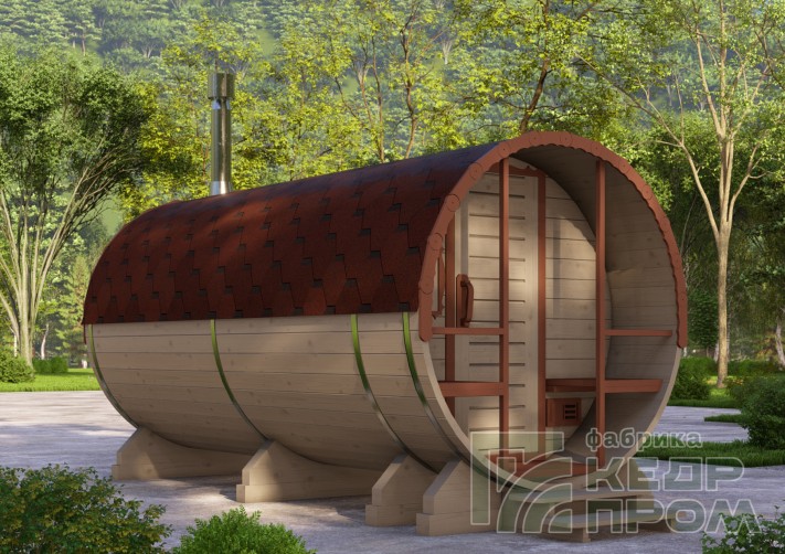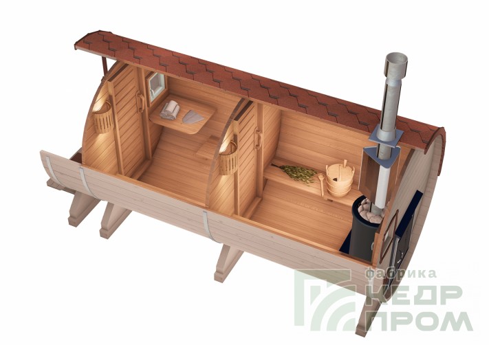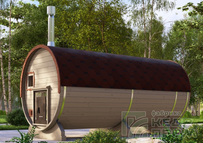 Баня бочка длиной 4,5 метра, в конструкции которой предусмотрена вместительная раздевалка и крыльцо со скамейками - идеальный вариант домашней баньки для тех, кто любит не только на славу попариться, но и поговорить по душам в компании близких людей.