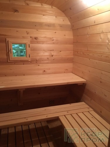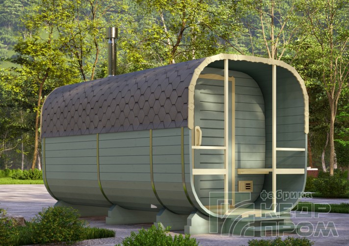 Квадратная баня бочка длиной 4,5 метра с верандой. Модель имеет два отделения внутри: парная и раздевалка, и небольшую веранду с двумя сидениями напротив друг друга. Оснащение и комплектация позволяет полноценно без дополнительных затрат пользоваться баней сразу при установке на участке. На производстве делается все под ключ.