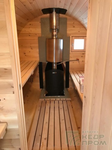 Баня-бочка классической круглой формы длиной 4 метра, но отличительной особенностью является вход с боковой стороны, что во многих случаях благоустройства участков и невозможности сделать вход с другой стороны. При этом внутреннее пространство бани не менее удобно, и даже наоборот более комфортное расположение стола и полков.