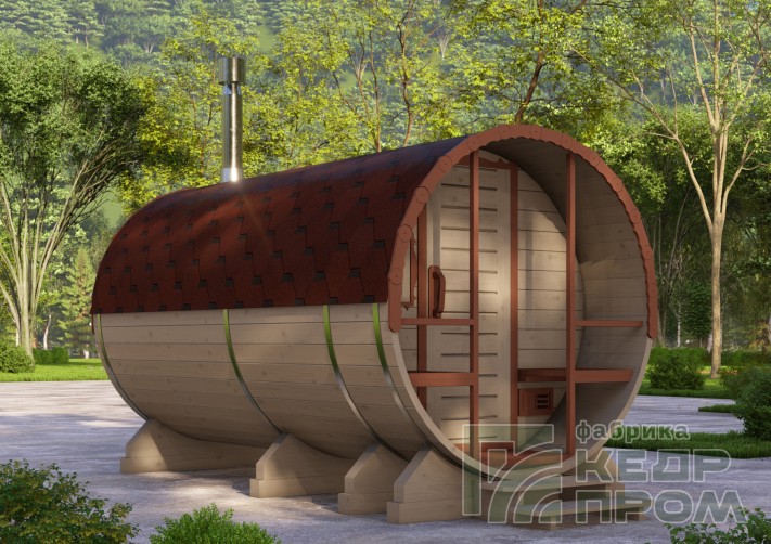 Баня-бочка квадратная длиной 4 метра с верандой. Баня имеет два отделения – парная и комната отдыха, а также открытую веранду или крыльцо с двумя сидениями. Комната отдыха у этой модели чуть меньше за счет добавления веранды, но парная полноценная и большая. Все остальное в комплекте: печь с камнями, бак для горячей воды, полки, трапики, окна.
