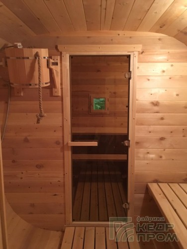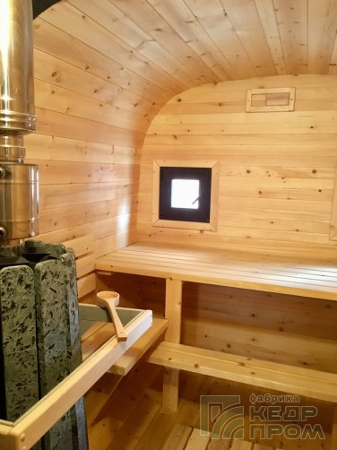 Баня бочка 4 метра длиной с верандой, или можно так сказать с крыльцом. По оснащению и комплектации аналогична предыдущим моделям такой же длины, за исключением изменения внутреннего размера комнаты отдыха, она стала чуть меньше, но зато появилось крылечко с двумя сидениями, где можно посидеть на свежем воздухе после жаркой бани.