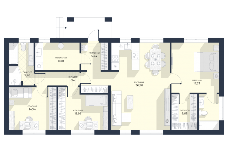 Дом, в котором всё продумано для вашего комфорта. Большой зал, столовая и кухня — именно здесь будут проходить и тихие семейные вечера, и весёлые праздники с гостями! Спальни для личного времени и отдыха!