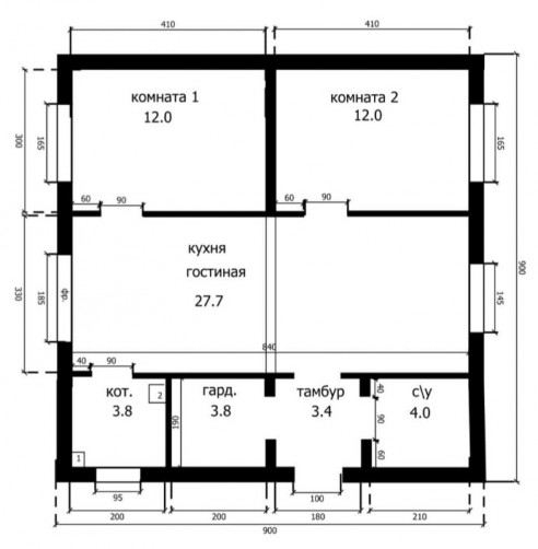 Классический вариант одноэтажного дома из газобетона. Предусмотрены 2 жилые комнаты, кухня-гостиная, санузел и котельная.