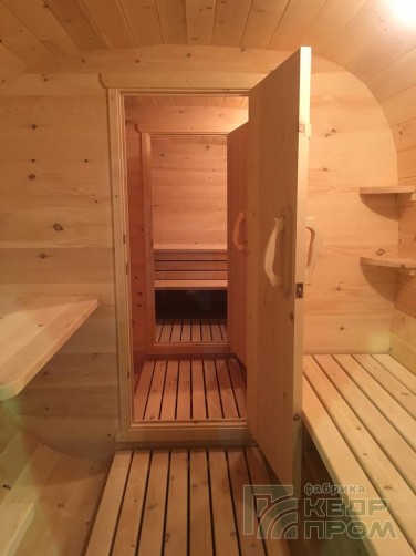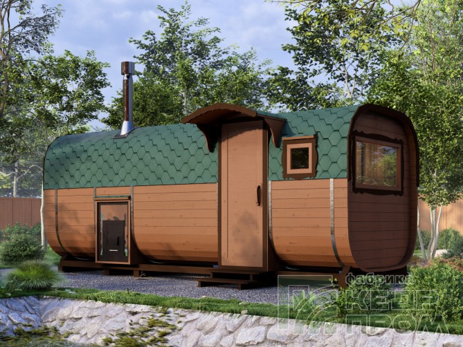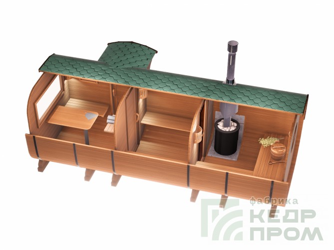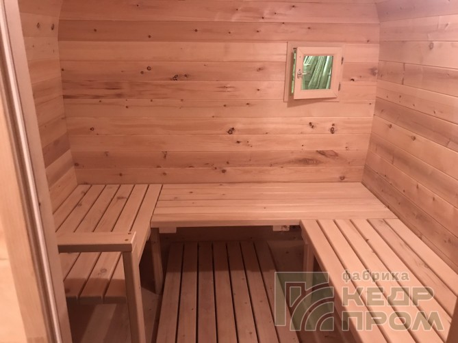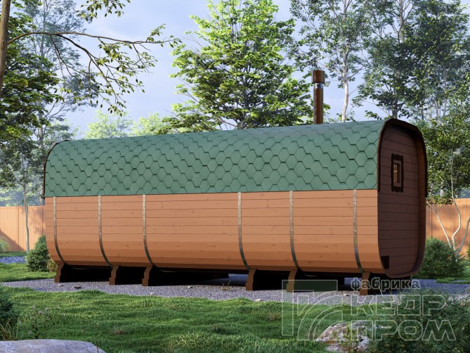 Квадратная 6-ти метровая баня-бочка из древесины кедра с боковым входом – максимум комфорта! Квадратная форма бани-бочки с закруглёнными углами придаёт необычный вид и увеличивает пространство внутри. Боковой вход в тамбур разделяющий парную от комнаты отдыха.