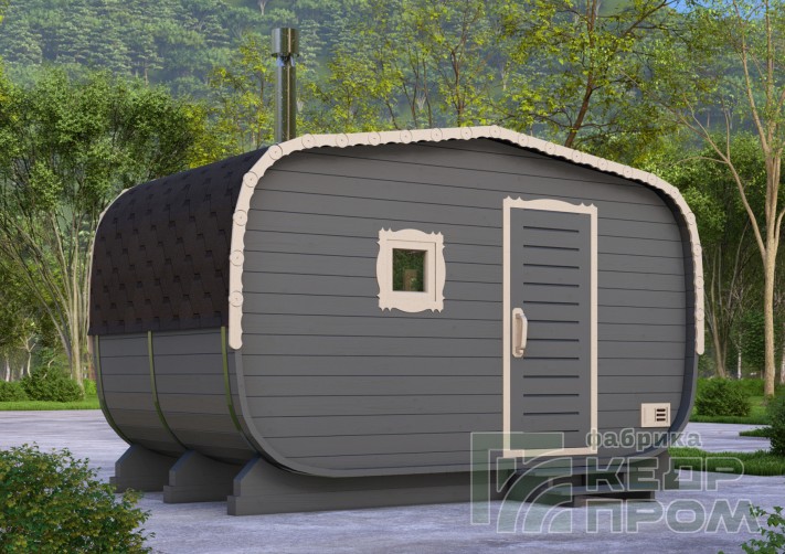 Квадро-овальная банька длиной 4 метра и шириной 2,35 метра. Отличается, в первую очередь, оригинальным внешним видом. Внутреннее оснащение бани - это просторная парная и комната отдыха, в которых имеется всё: печь в комплекте с дымоходом, удобные полки, трапики, стол, сидения, окна, и даже камни для печи, докупать ничего не нужно.