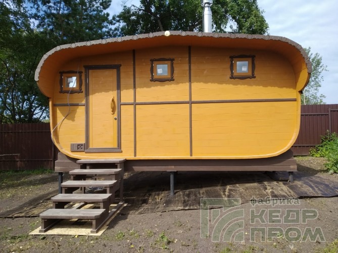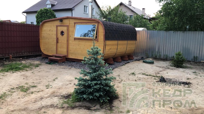 Баня-бочка из кедра квадро-овал с кухней и душем 6х2,35м №235