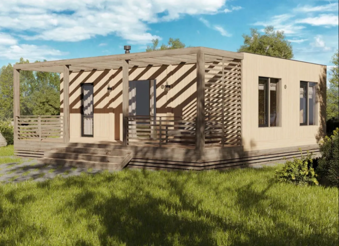 Одноэтажный дом с крыльцом и прилегающей террасой – отличное решение для постоянного проживания 1-2 человек. Особенности проекта – небольшая прихожая и полностью укомплектованный санузел. Ванна или душевая кабина – выбор за вами.