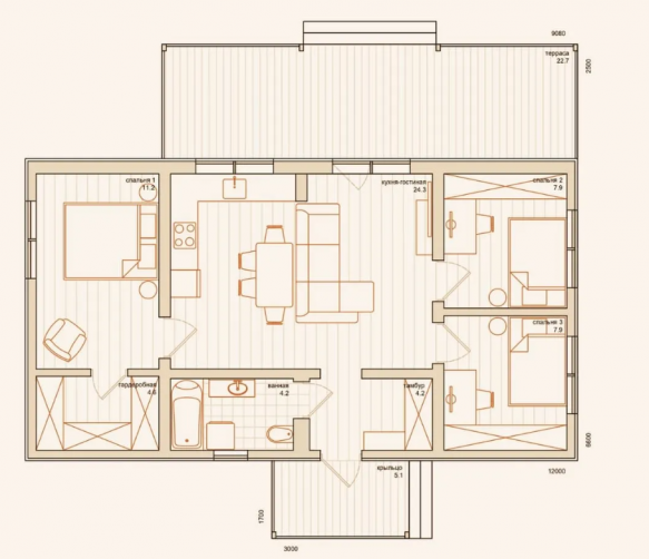 Комфортный и уютный дом на одну семью. В здании 3 спальных комнаты, поэтому жилого пространства достаточно для 4 и более человек. Высота потолков составляет 2,55 м.