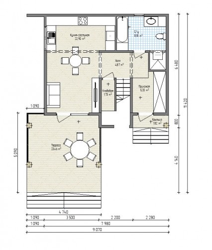 Во второй части доме на первом этаже большая кухня-гостиная, площадью 22,9 м2. Из гостиной есть выход на крытую террасу (23,46 м2).