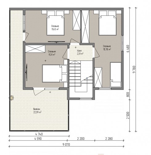 На втором этаже холл площадью 2,31 м2 и три спальни. Про одну мы еще упоминали. Еще две имеют выходы на балкон и площадь 11,45 и 11,31 квадратных метра. Также стоит упомянуть балкон размером без малого 23 м2.