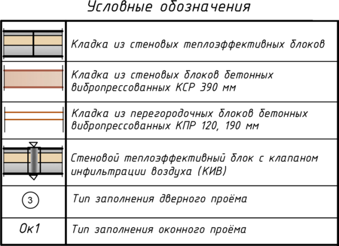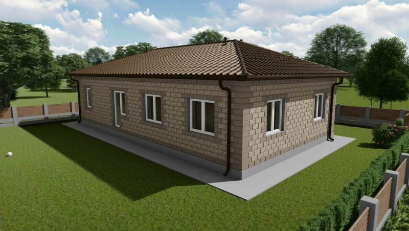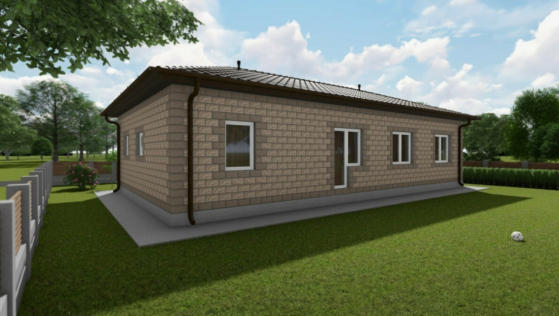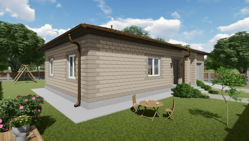 Проект предполагает в томе - тамбур 4 м2; холл 12,88 м2; кухня-гостиная 27,21 м2; три жилые комнаты 11,17 - 11,68 - 11,66 м2; санузел совмещен с ванной комнатой 5,38 м2 (при желании разделяется); кладовая - 4 м2; гараж - 25,34 м2 и котельная 7,08 м2