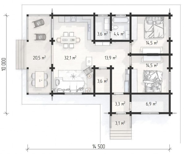 Дом отлично подойдёт как дача или постоянное жильё для небольшой семьи. Просторная гостиная с кухней и столовой объединяет зоны отдыха и общения, а большая терраса становится продолжением дома — местом для завтраков на свежем воздухе и вечерних бесед.