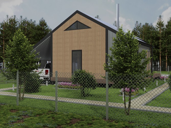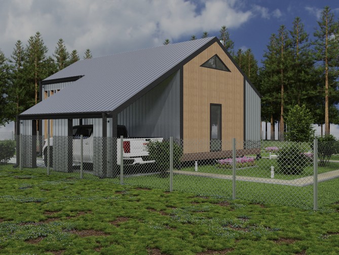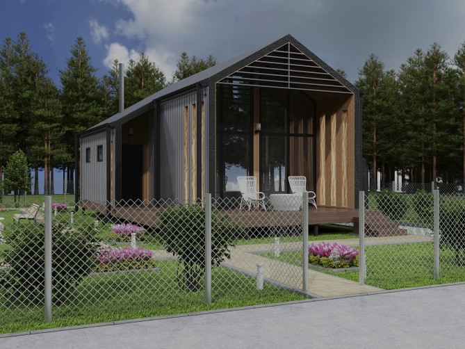 Дом в стиле Барнхаус – брутальность снаружи и уют внутри. 2 этажа с панорамными окнами, 2 комнаты, антресоль, терраса.