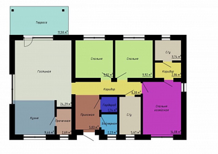 Проект одноэтажного дома в современном стиле с двускатной крышей, с гардеробной, примерочной и большой террасой. Имеется 3 спальни.