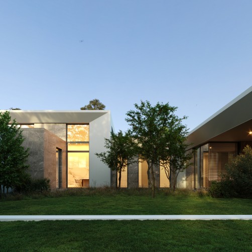 Одноэтажный загородный дом в стиле Райта гармонично вписывается в окружающий ландшафт. Его открытые пространства создают ощущение свободы и легкости. Большая терраса с бассейном и просторная веранда с зоной барбекю обеспечивают идеальные условия для отдыха на свежем воздухе.