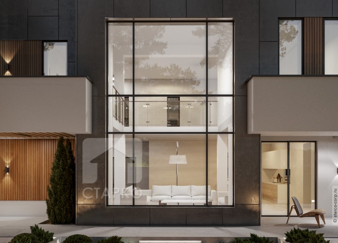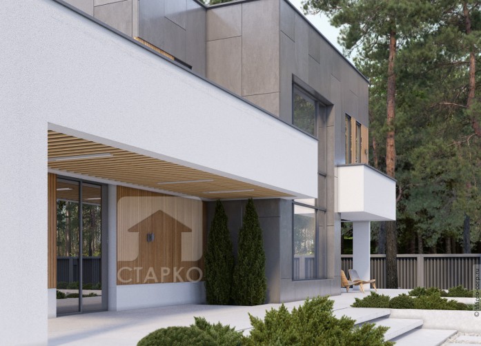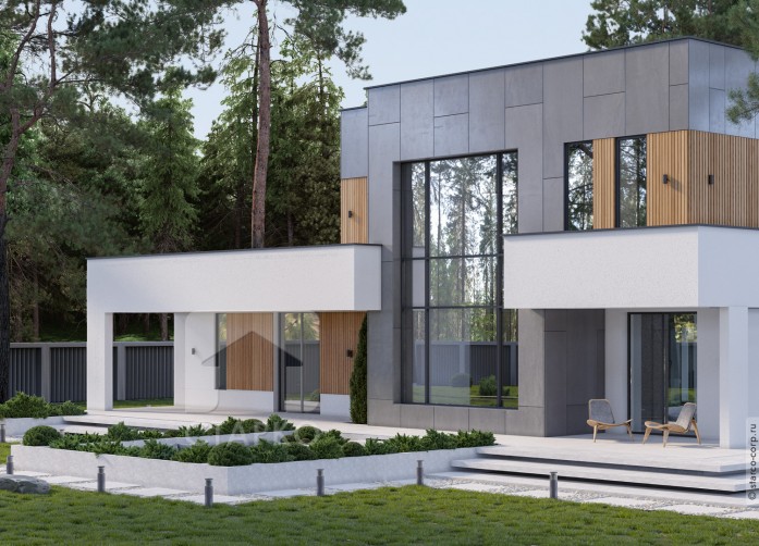 Гармоничный, лёгкий, стильный дом. Архитектура в стиле современного минимализма: простые формы, плоская кровля, большая площадь остекления. Коттедж притягивает взгляды, восхищает своей простотой и одновременно уникальностью.