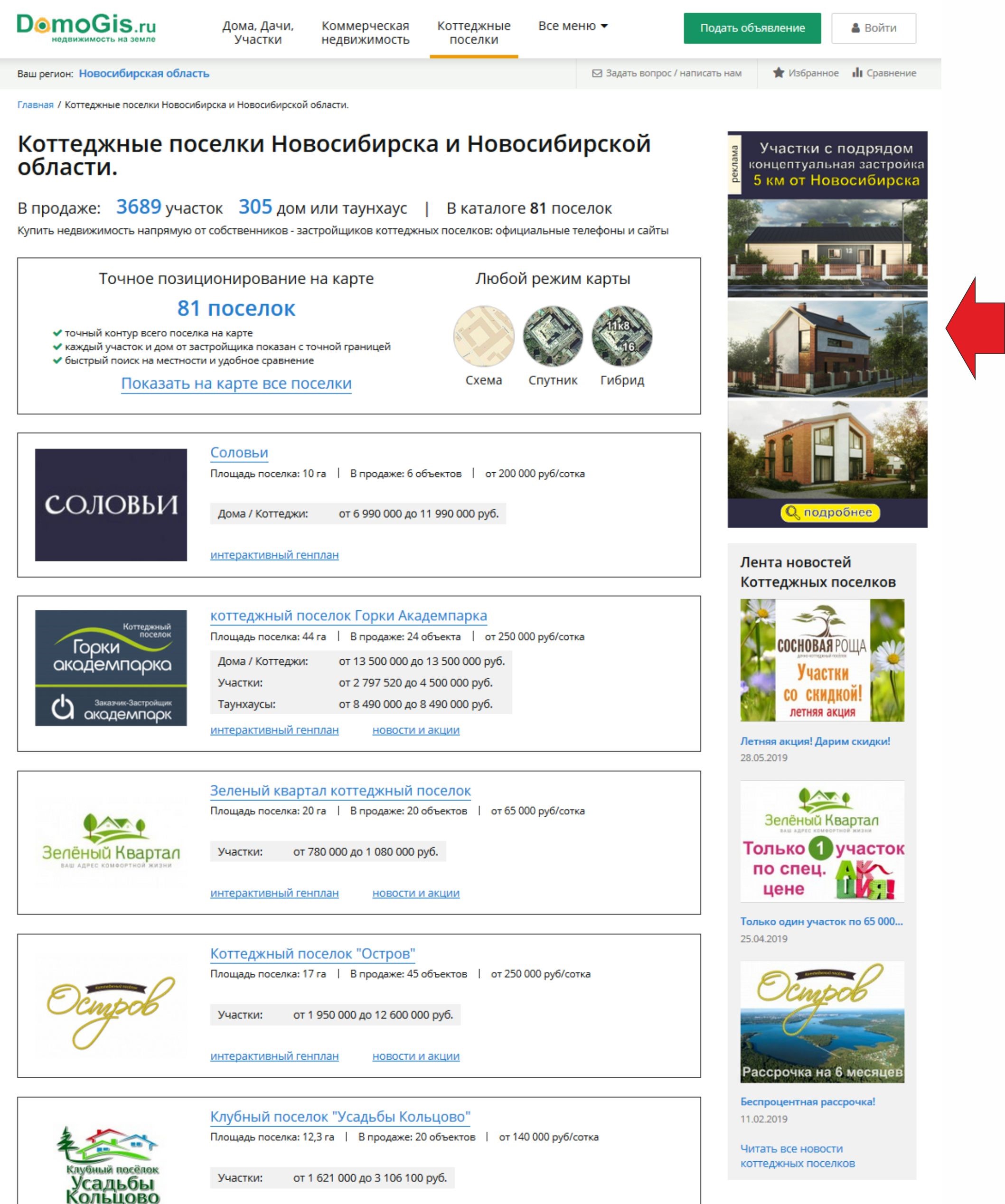 Рекламные баннеры могут быть размещены на разных страницах сайта ДомГис: в каталогах объектов, поселков; на страницах объектов, поселков; на страницах избранное и сравнение; на странице карта.
