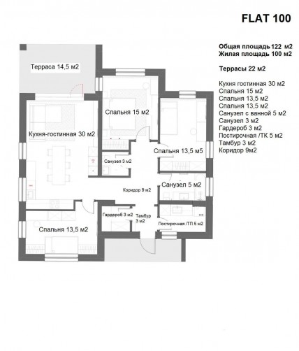 Участок с подрядом. Просторный одноэтажный дом 110 м2 с тремя спальнями: мастер-спальня со своим сан-узлом и гардеробом и две детские, просторной кухней-гостинной с выходом на террассу.