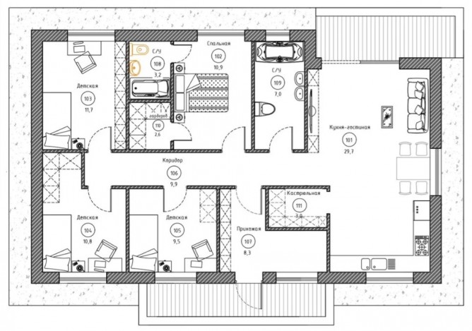 Одноэтажный дом с комбинированным фасадом.