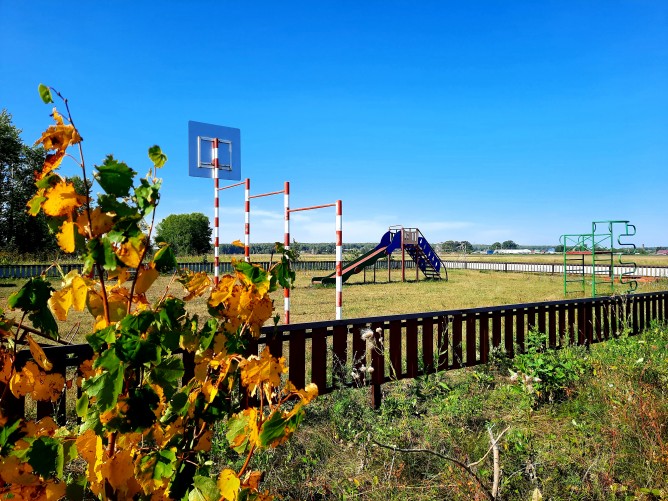 простираются зеленые поля, на территории есть озеро.