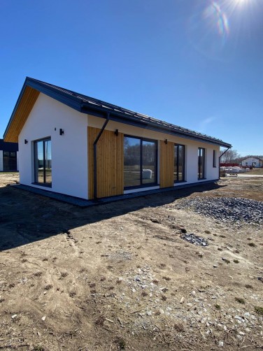 Фасад дома - декоративная штукатурка и строганная доска.