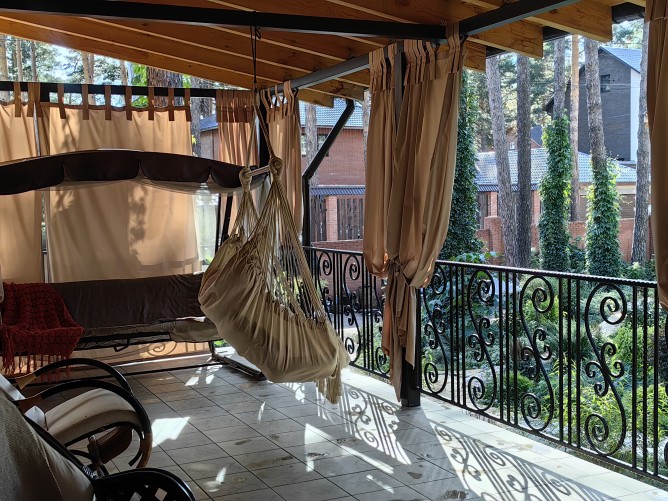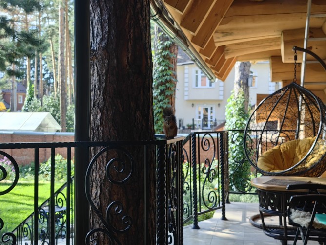 Терраса благоустроенная 60 кв.м с выходом во двор. На террасе стоят ратанговые кресла, кресло-качалка, столик. Можно пить чай-кофе, любоваться соснами и наслаждаться пением птиц. Частенько заглядывают белки! Иногда встречаются ёжики.