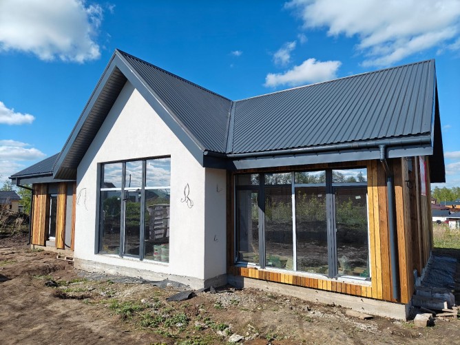 🔧 Строительство как для себя:• Фундамент — ж/б плита 300 мм, двойное армирование• Стены — Сибит 400 мм (тепло/прохлада)• Перегородки — 200 мм (шумоизоляция)• Кровля — профлист, утепление 200 мм• Окна — антрацит, панорамные 2,5 м• Фасад — Церезит + лиственница• Септик — 9 м³, двухкамерный