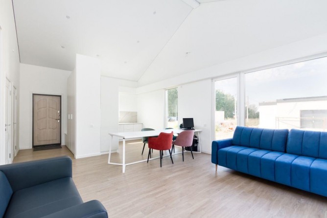 В доме большая кухня-гостиная с кухонным гарнитуром, большим обеденным столом, 2 дивана, 4 стула.