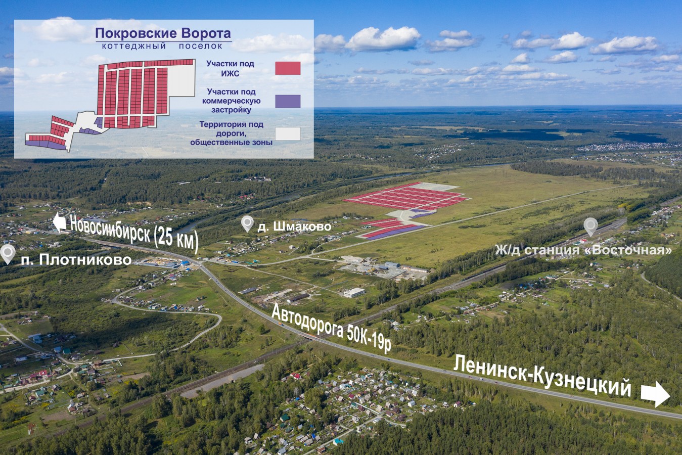 Коттеджный поселок Покровские ворота является микрорайоном населенного пункта д. Шмаково, который непосредственно примыкает к п. Плотниково. Такое расположение обеспечивает доступность для жителей к готовой инфраструктуре данных населенных пунктов. Статус участков ИЖС - это прописка, дополнительные соц. гарантии.