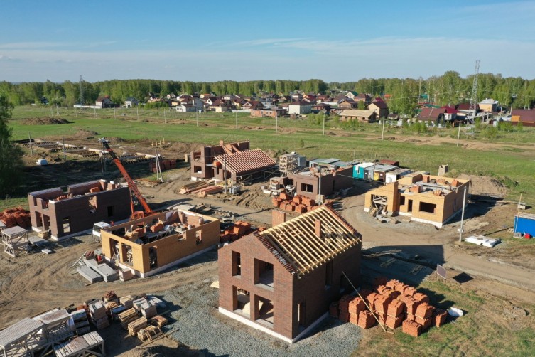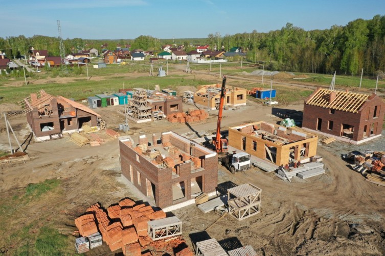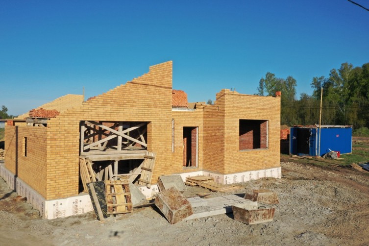 В коттеджном поселке "Смарт" активно идет строительство кирпичных домов. Шесть домов уже выводятся под крышу, а фундамент еще четырех домов заложен.
