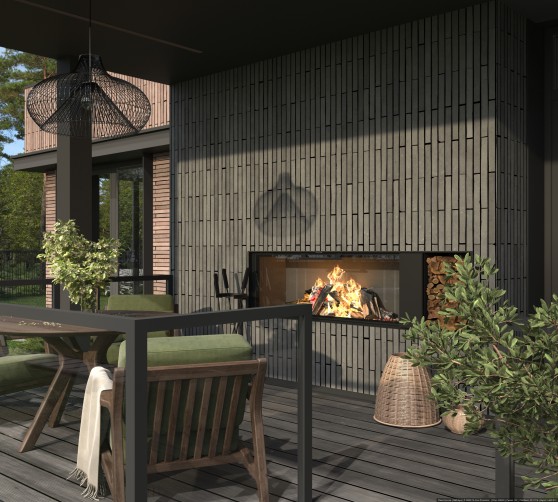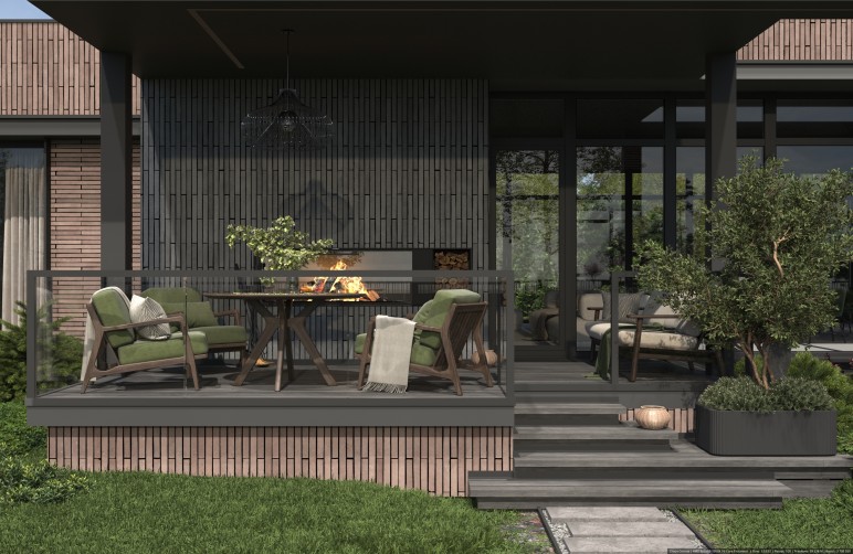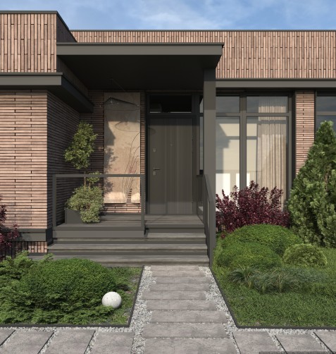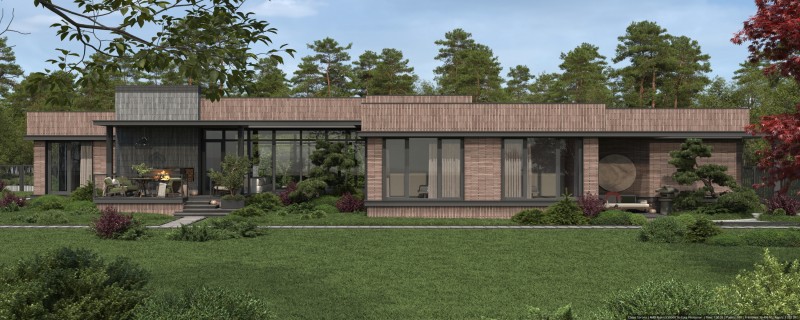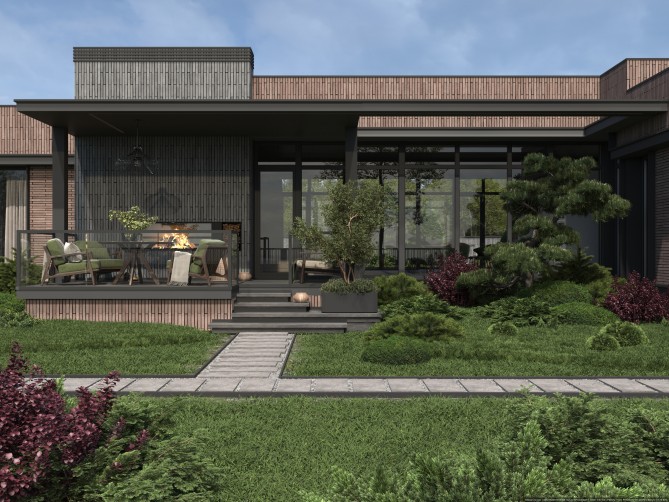 Дом сочетает в себе строгие геометрические формы с элементами природной эстетики. Просторные панорамные окна обеспечивают естественное освещение и визуальную связь с окружающим ландшафтом. Он идеально подходит для комфортной жизни, объединяя современный дизайн и функциональность.