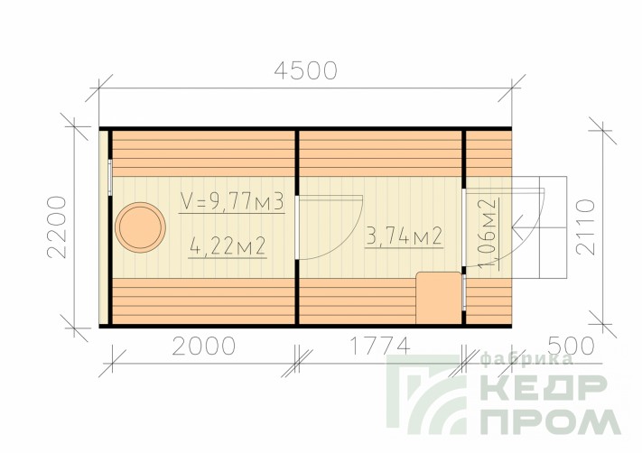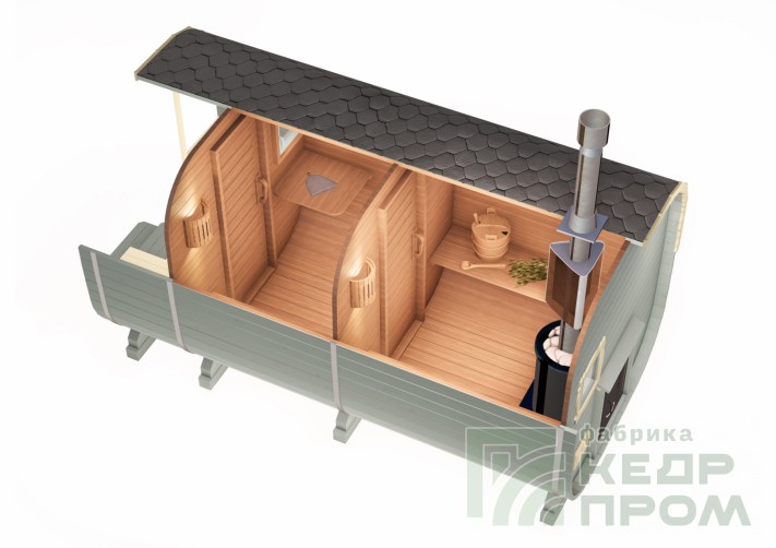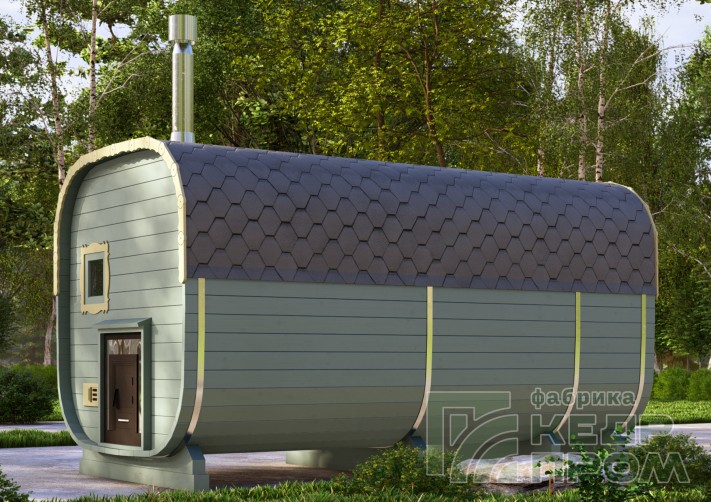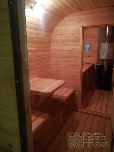 Квадратная баня бочка длиной 4,5 метра с верандой. Модель имеет два отделения внутри: парная и раздевалка, и небольшую веранду с двумя сидениями напротив друг друга. Оснащение и комплектация позволяет полноценно без дополнительных затрат пользоваться баней сразу при установке на участке. На производстве делается все под ключ.