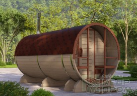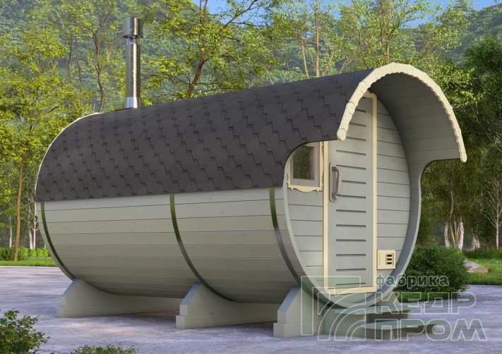 Баня-бочка длиной 4 метра с козырьком над входом, увеличенная длина бани позволяет разместить не только вместительную парную, но и комфортабельную раздевалку или комнату отдыха, в которой комфортно может находиться несколько человек. Одна самых популярных моделей в нашем ассортименте бань.