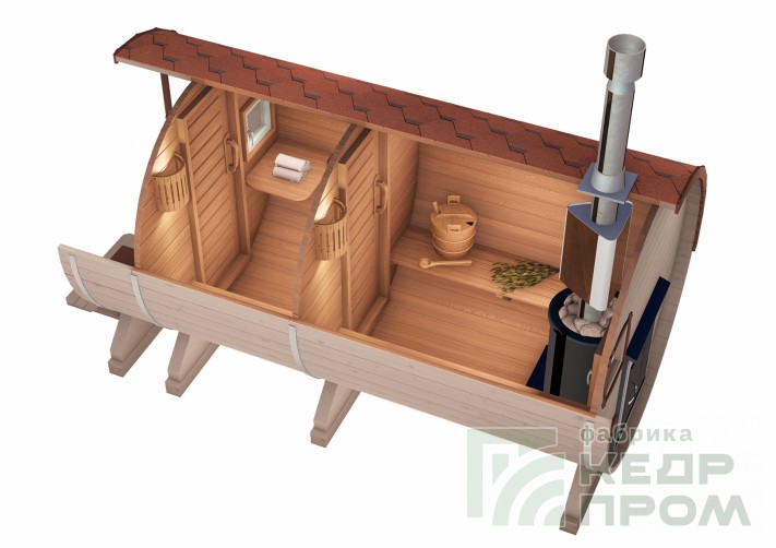 Баня-бочка квадратная длиной 4 метра с верандой. Баня имеет два отделения – парная и комната отдыха, а также открытую веранду или крыльцо с двумя сидениями. Комната отдыха у этой модели чуть меньше за счет добавления веранды, но парная полноценная и большая. Все остальное в комплекте: печь с камнями, бак для горячей воды, полки, трапики, окна.